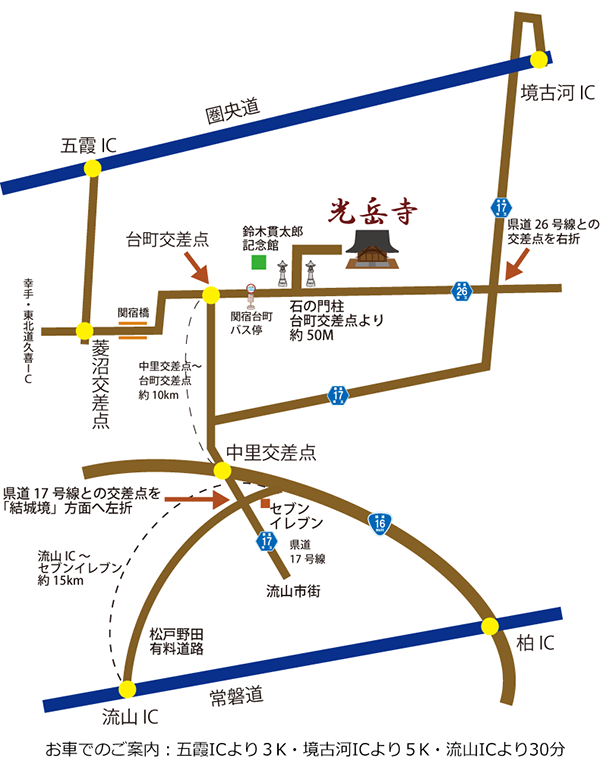 住所・連絡先 ○ 住所 〒270-0202 千葉県野田市関宿台町2946 ○ 電話番号 受付:関宿光岳寺本院 04-7196-0322 交通機関